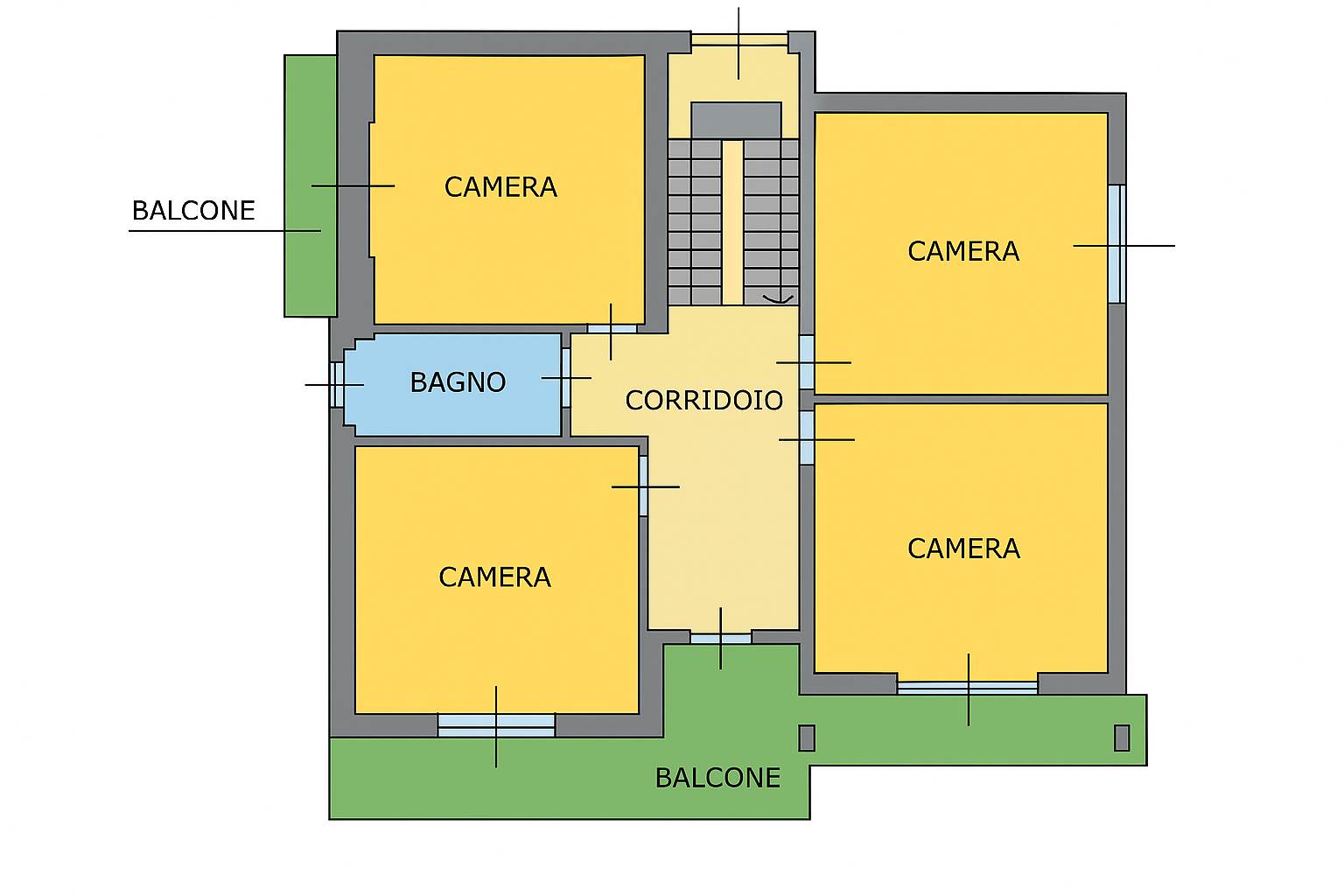 Ogni appartamento è composto da ampio ingresso, soggiorno, cucina abitabile, due camere matrimoniali ed un servizio. E' possibile creare per ogni unità il proprio ingresso completamente indipendente e ricavare una eventuale terza camera o secondo servizio.