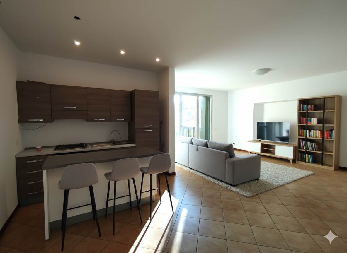 L'appartamento al piano primo, libero subito, è composto da ingresso, soggiorno di grandi dimensioni con cucina a vista e balcone, disimpegno, camera matrimoniale e servizio finestrato con doccia.
