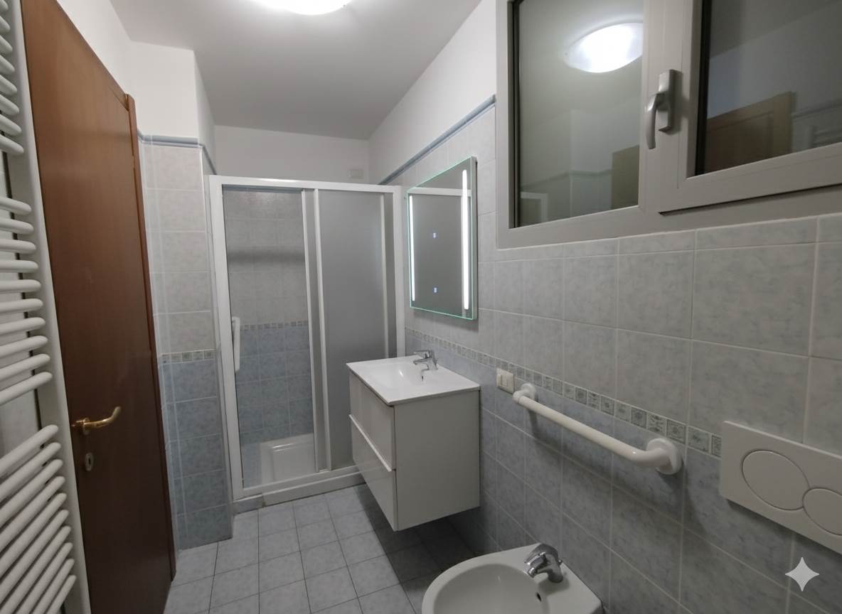 L'appartamento al piano primo, libero subito, è composto da ingresso, soggiorno di grandi dimensioni con cucina a vista e balcone, disimpegno, camera matrimoniale e servizio finestrato con doccia.
