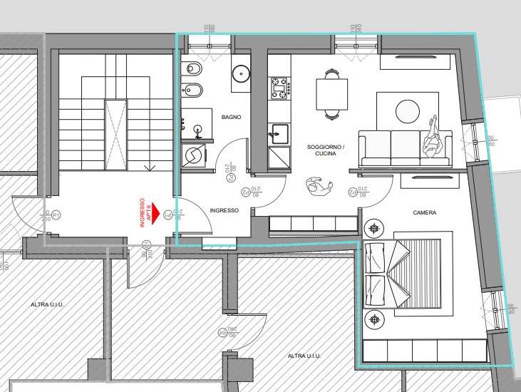 L'immobile si compone di una ampia zona soggiorno living caratterizzata da ampie vetrate con cucina a vista, un grande disimpegno uso cabina armadio, una grande camera matrimoniale e da un servizio di ampia dimensione.